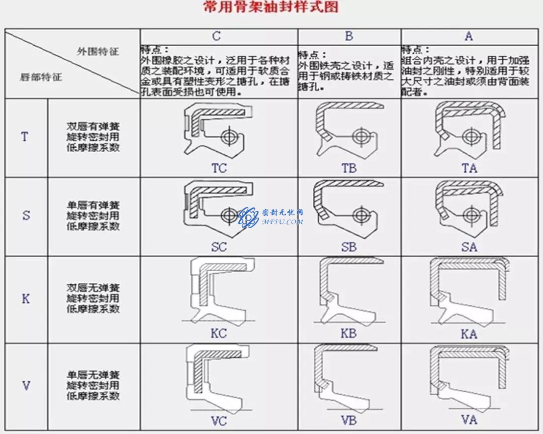 C型骨架油封為內骨架油封可分為SC型、TC型、VC型、KC型、DC型這五種,分別是單唇內骨架油封、雙唇內骨架油封、單唇無簧內骨架油封、雙唇無簧內骨架油封、雙唇雙簧內骨架油封。
