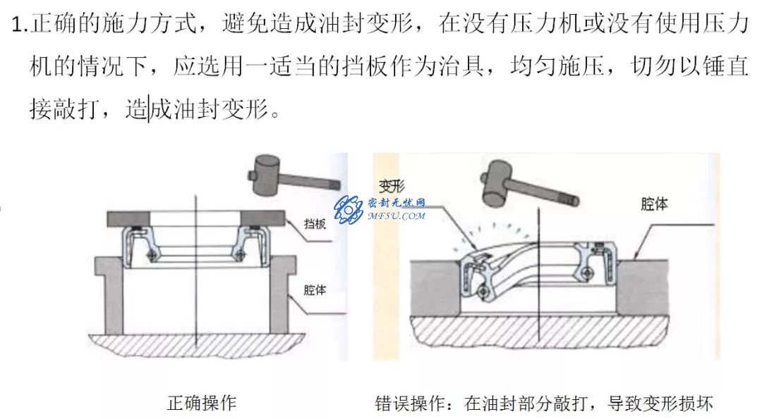 10、裝入新油封時,為了使其離開舊的唇部接觸部位,應使用墊片避開原來的摩擦痕跡。