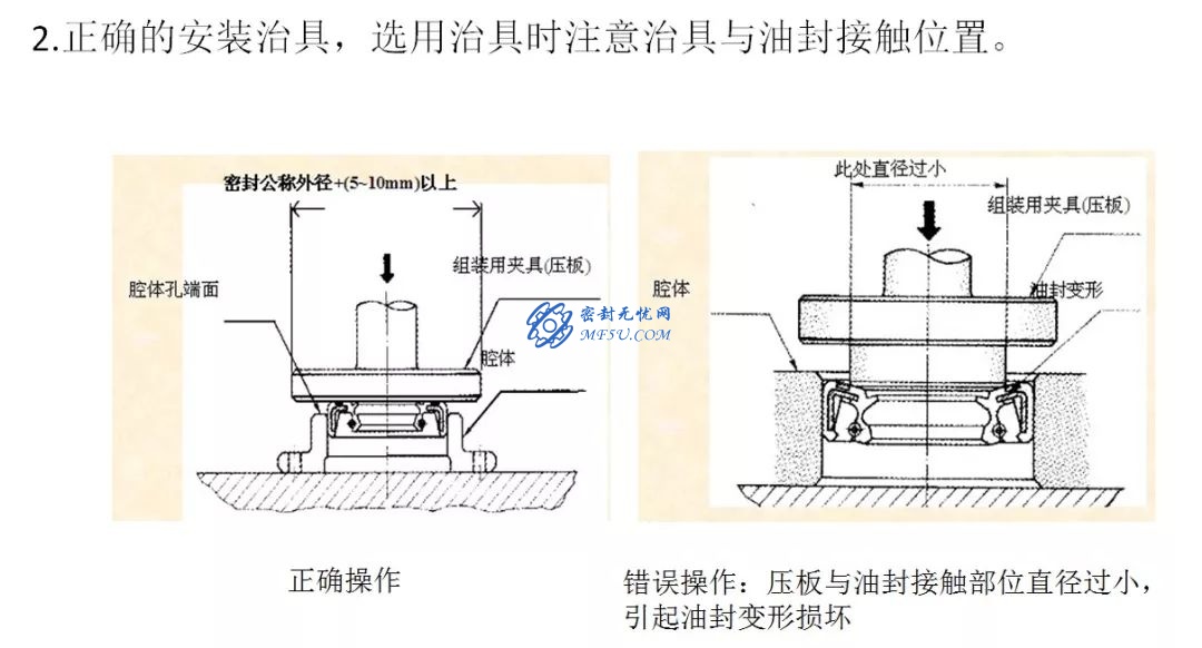 6、油封唇緣通過的螺紋、鍵槽、花鍵等處應采取各種措施來防止唇緣損傷,并用專用工具裝配。