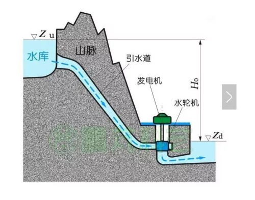 在河流高處建立水庫蓄水提高水位,在較低的下游安裝水輪機,通過引水道把上游水庫的水引到下游低處的水輪機,水流推動水輪機旋轉帶動發電機發電,然后通過尾水渠到下游河道,引水道會較長并穿過山體,這是一種引水發電的方式。